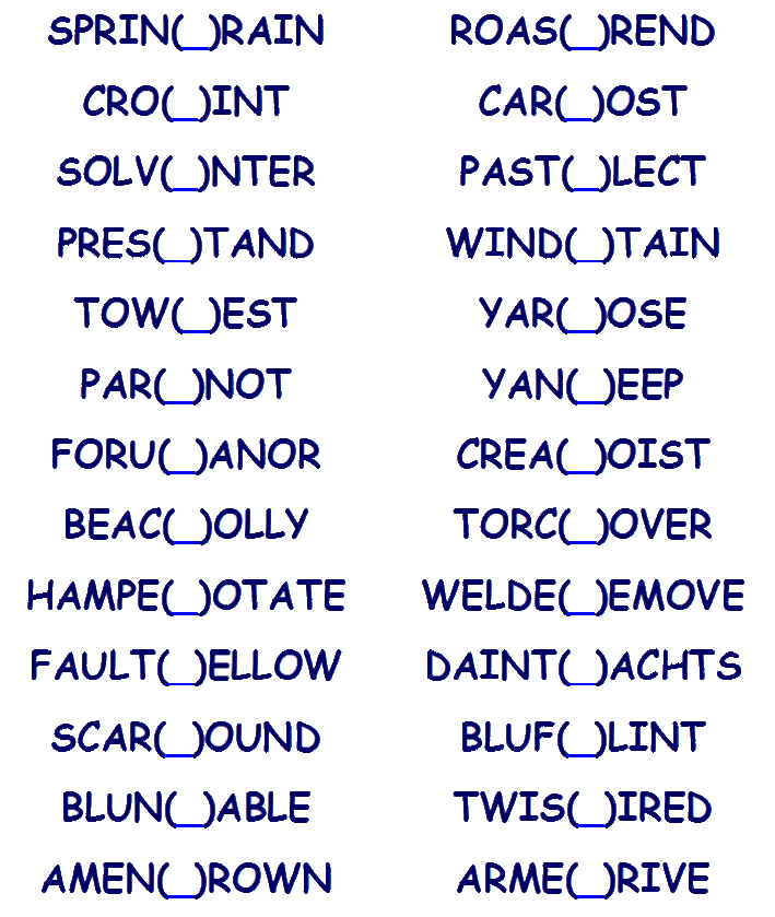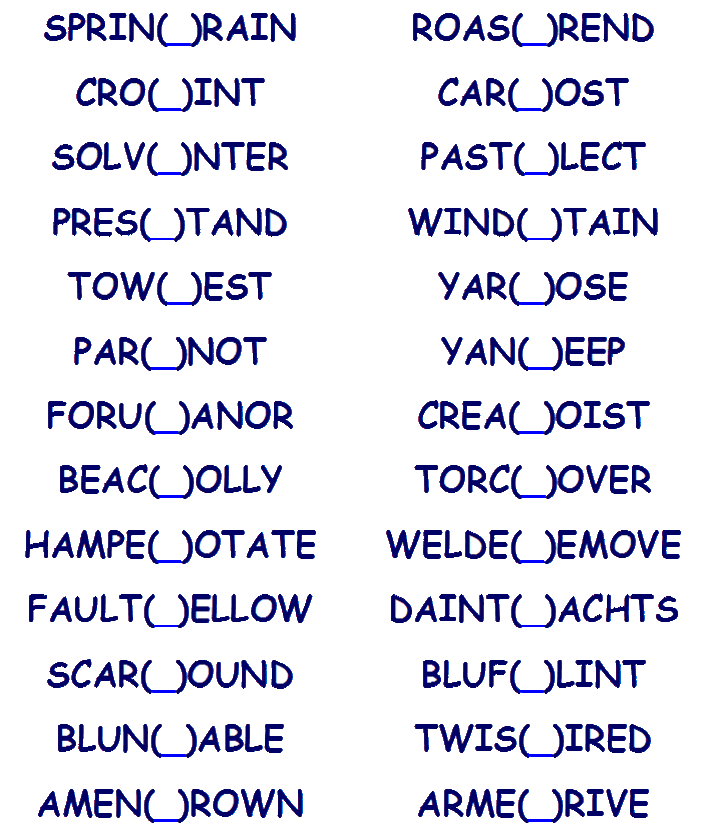 The aim of this task is to insert a letter into the bracket, and once inserted, it should create an independent word to the left of the bracket and a separate, independent word to the right of the bracket. Whatever letter you use for the words on the left, you have to use the same letter for the words on the right.